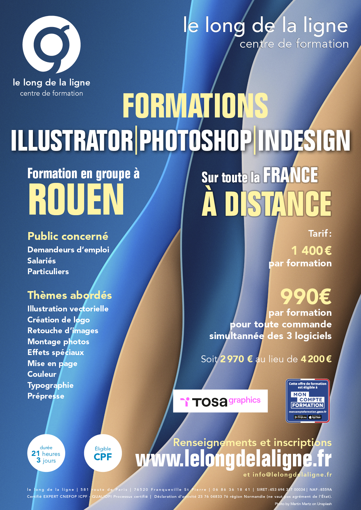 Nous organisons des sessions en centre ainsi que des sessions sur mesure sur toute la France. Vous pouvez par-exemple suivre une formation qui vous permettra de maîtriser les fondamentaux de la mise en page professionnelle avec Adobe InDesign (certification TOSA), ou encore une formation au traitement d'images avec Adobe Photoshop (certification TOSA), une formation à la création graphique avec Adobe Illustrator (certification TOSA), une formation au montage vidéo avec Apple Final Cut Pro ou Adobe Premiere Pro, une formation à la bureautique (certification TOSA) avec Microsoft Word (certification TOSA), Excel (certification TOSA) et PowerPoint (certification TOSA), une formation en web avec Adobe Dreamweaver, WordPress, une formation à l'animation avec Adobe Animate, une formation en 3D avec AutoCAD, une formation à la création d'une boutique e-commerce avec Shopify, une formation à la création d'effets spéciaux vidéo avec Adobe After Effects ou Apple Motion.