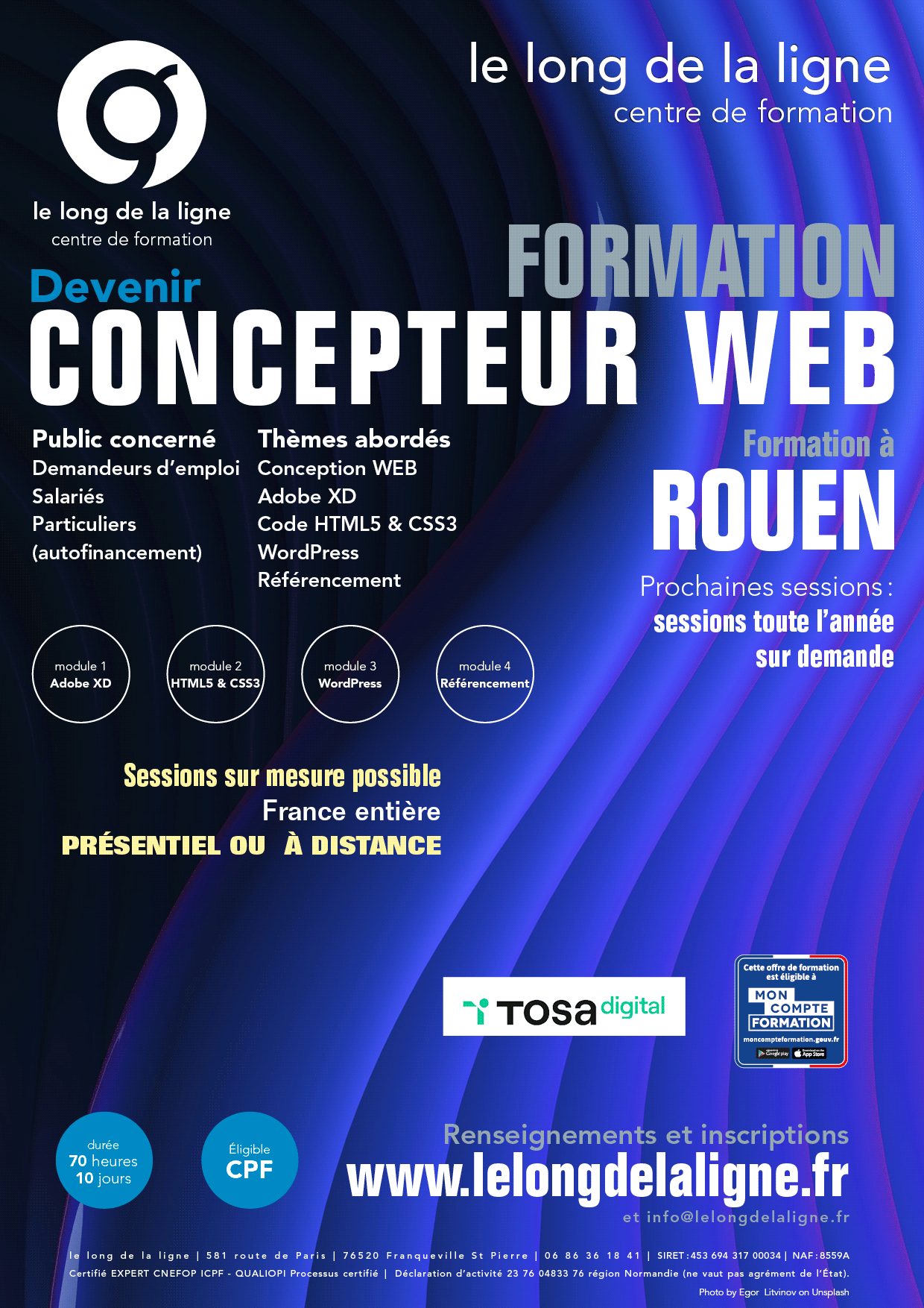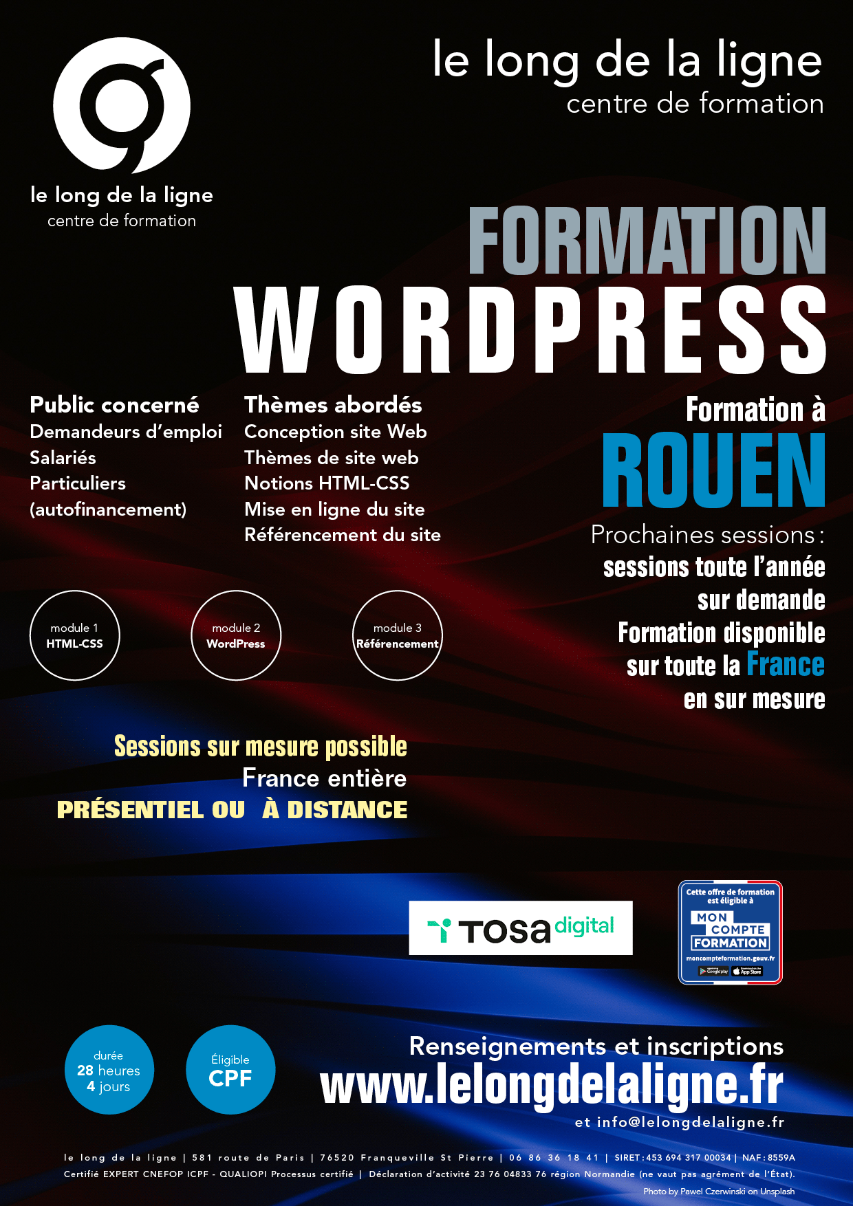 Des sessions de formation en centre sont créées à Rouen et l'intégralité de notre offre de formation est disponible sur la France entière, en formation montée sur mesure (celle-ci devra se dérouler dans vos locaux (entreprise ou domicile), dans ce cas-là un supplément de 30% par-rapport au tarif affiché s'applique.